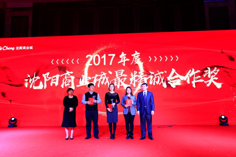 活動(dòng)現(xiàn)場,陳哲元董事長、鐘靜總經(jīng)理代表沈陽商業(yè)城向萃華金店、周大福品牌、遼寧和慧倉商貿(mào)、影兒會(huì)所頒發(fā)了2017年度最精誠合作獎(jiǎng)。